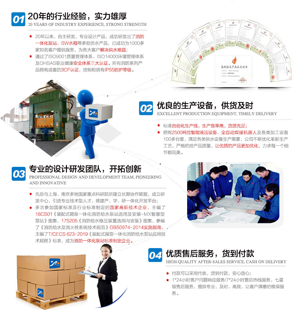 我公司以產(chǎn)品為導(dǎo)向與國家重點(diǎn)科研院所建立長期協(xié)作聯(lián)盟,成立了研發(fā)中心并先后開發(fā)了幾十個專利項(xiàng)目,抗浮箱泵一體化成套設(shè)備等多個產(chǎn)品被列為江蘇省高新技術(shù)產(chǎn)品。主編的...